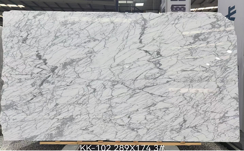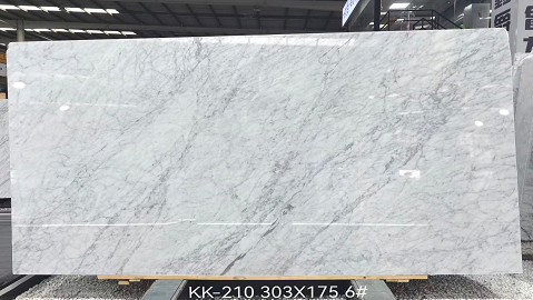 PLENSCO Carrara Classico marble slab: soft white-grey background with fine, linear, and delicate veins typical of Carrara. The rendering is classic, elegant, and neutral.