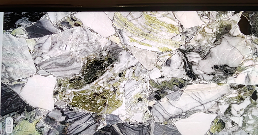 PLENSCO Vert Impérial marble slab (Unique Green Vein Marble): a deep and rich dark green background, contrasted by expressive and bold white or gold veins. The rendering is luxurious and rare.